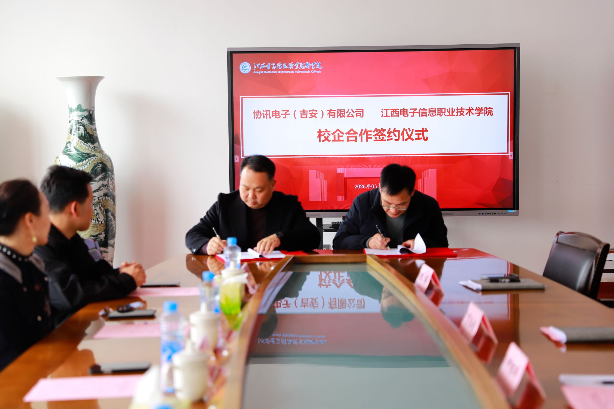 3月25日,我校与协讯电子(吉安)有限公司举行校企合作签约仪式。协讯电子(吉安)有限公司人资行政总监刘淑平,人事经理廖丽珍,高级工程师周庭辉,培训中心主管钟声建,校党委书记肖红秋,党委委员、副校长钟端玮,以及相关部门负责人共同出席仪式。
