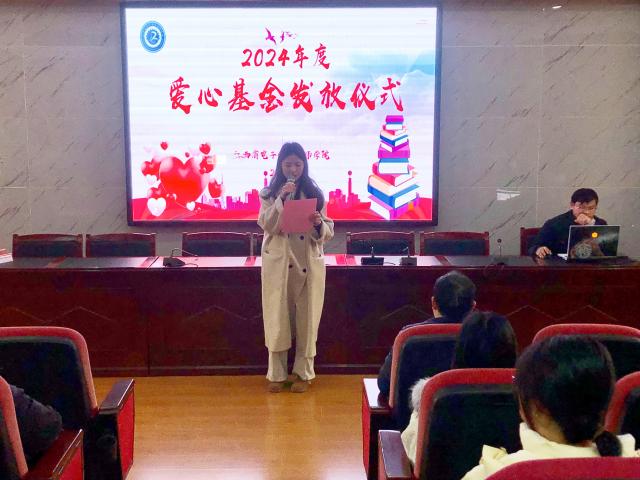 会上,团委书记李梦茹首先介绍了2024年爱心基金发放的基本情况。随后,受助学生代表符毅同学上台发表感言,并代表受助的127名同学向学校领导、老师和同学们表示衷心的感谢,表示会珍惜学习机会,坚定报国理想,刻苦学习,积极进取,自强不息,不辜负学校的期望。