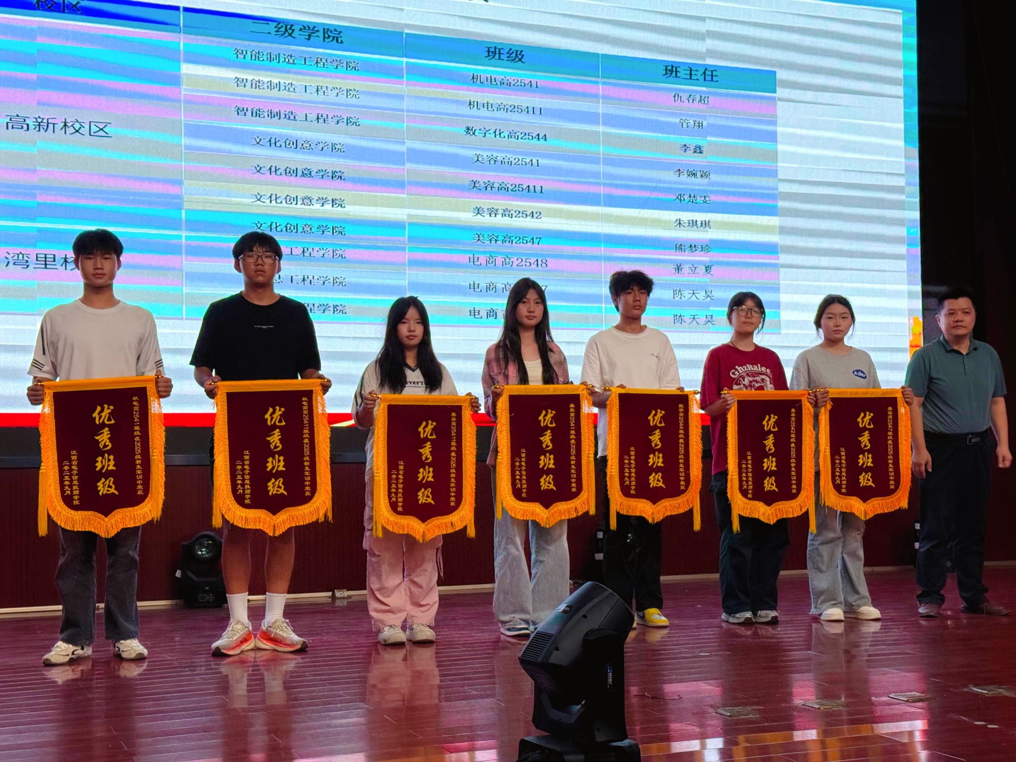 仪式上宣读了军训期间表现突出的优秀班级和优秀学员名单,并为优秀班级颁发了锦旗,为优秀学员颁发荣誉证书。机电25411班姜凡同学作为优秀学员代表发言,分享了军训期间的成长经历与真切感悟,展现出2025级新生积极进取、勇于担当的精神风貌。